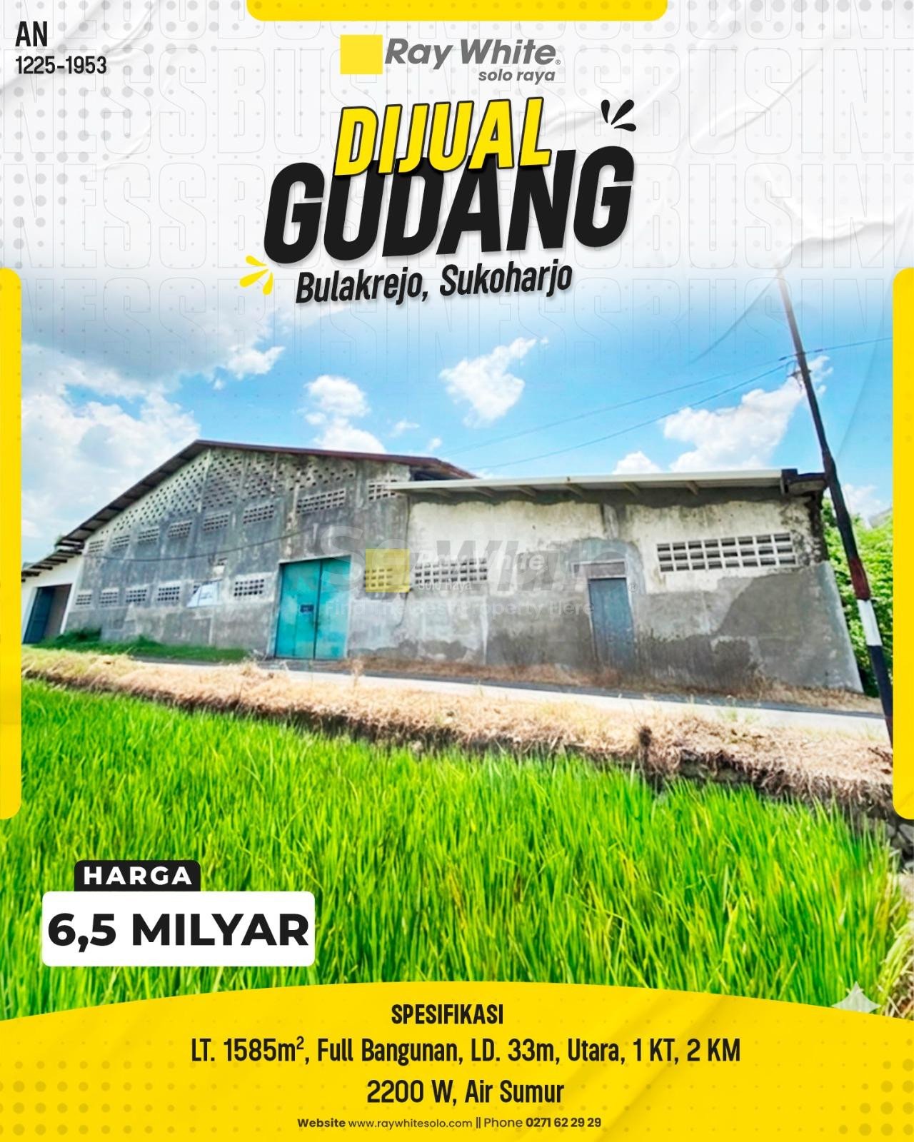Dapatkan aset properti komersial yang sangat potensial di gerbang masuk Kota Sukoharjo. Gudang dengan luas tanah 1.585 m² ini menawarkan ruang penyimpanan yang maksimal karena kondisi bangunan yang hampir memenuhi seluruh lahan (Full Bangunan). Dengan lebar depan yang sangat ideal (33 meter), properti ini memberikan aksesibilitas yang sangat baik untuk manuver kendaraan logistik. Lokasinya di Bulakrejo sangat strategis karena berada di jalur penghubung antara kawasan industri Parangjoro, pusat bisnis Solo Baru, dan pusat pemerintahan Sukoharjo. Sangat cocok untuk gudang distributor, pabrik, atau workshop skala besar.
