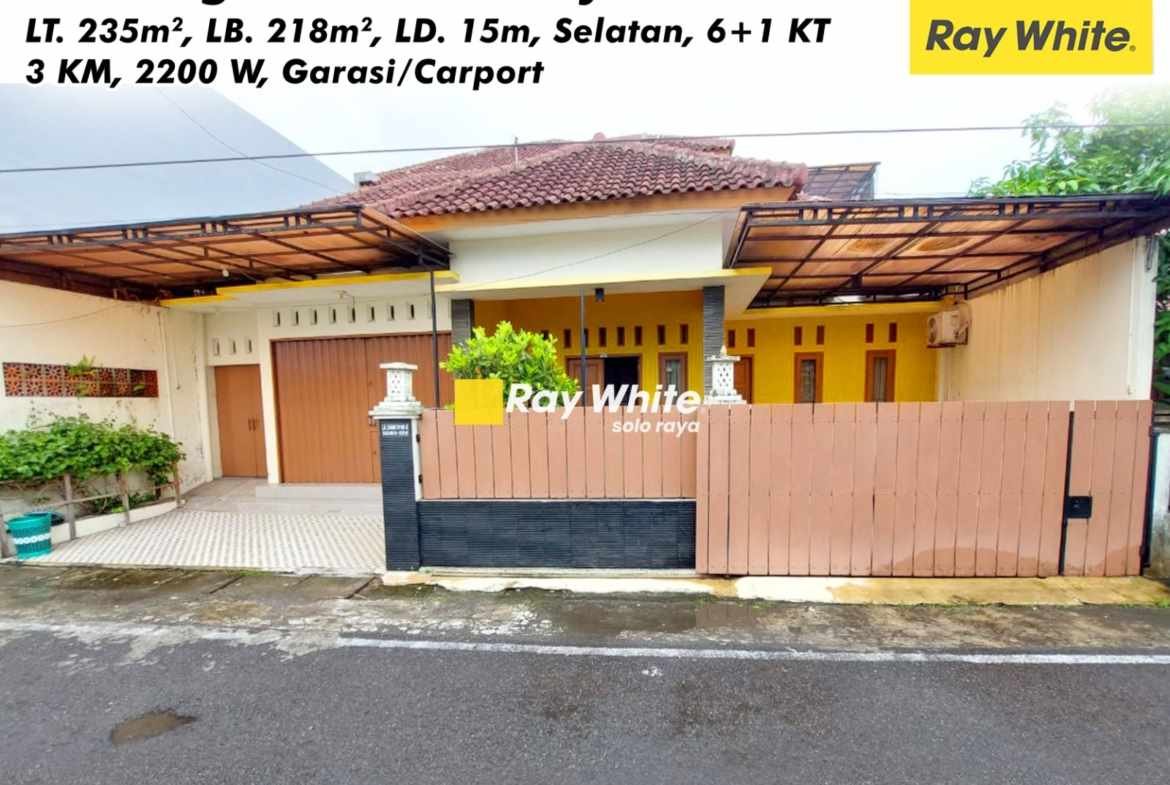 Luas Tanah 235m2, Luas Bangunan 218m2, Lebar Depan 15m, Hadap Selatan, 6+1 Kamar Tidur, 3 Kamar Mandi, Listrik 2200w, Garasi,Carport
