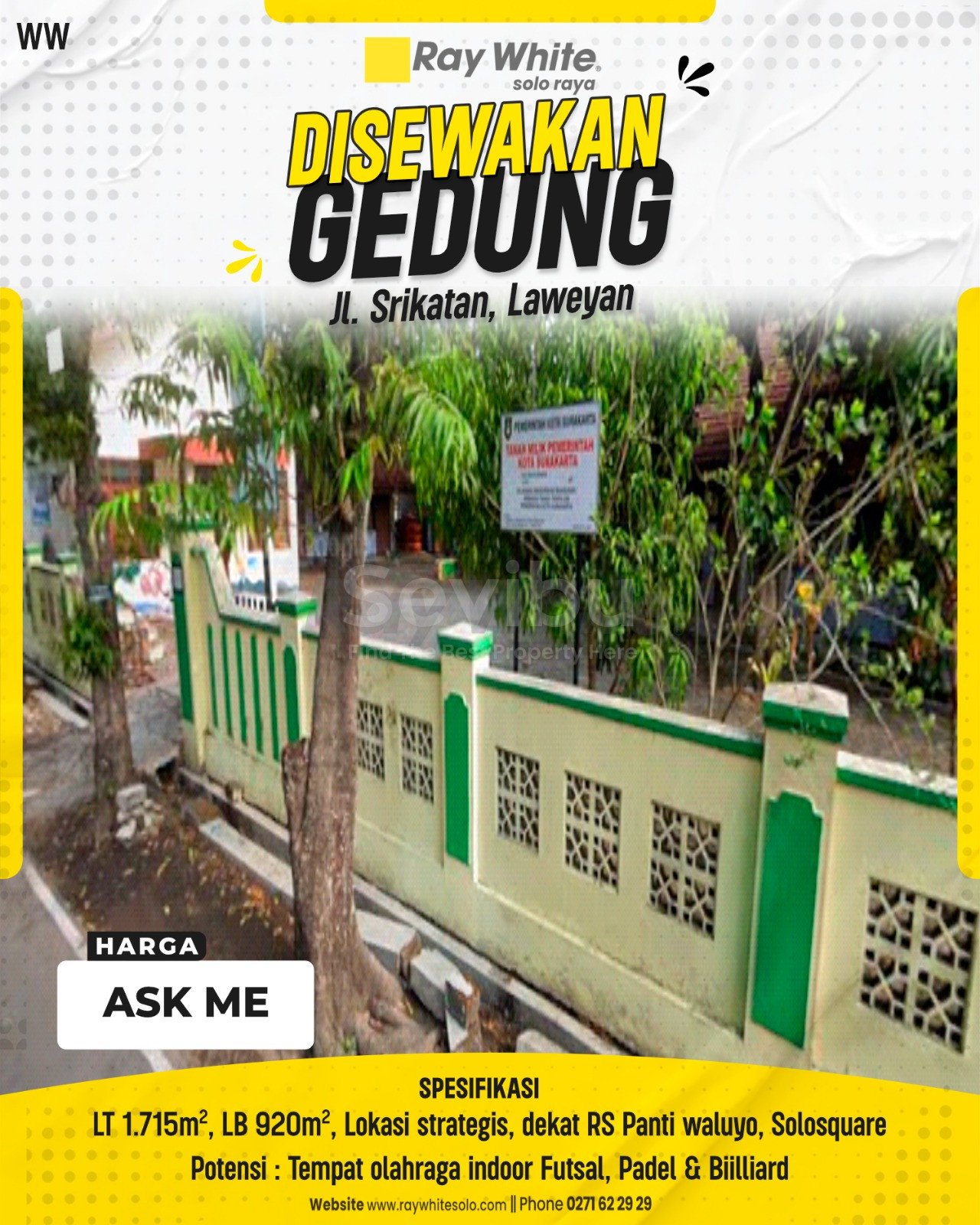Peluang bisnis lifestyle dan olahraga yang sangat menjanjikan di lokasi strategis! Disewakan gedung dengan lahan yang sangat luas di Jalan Srikatan, Laweyan. Lokasi ini merupakan area “pusat kota kedua” yang sangat hidup karena hanya selangkah dari Solo Square Mall dan Stasiun Purwosari.