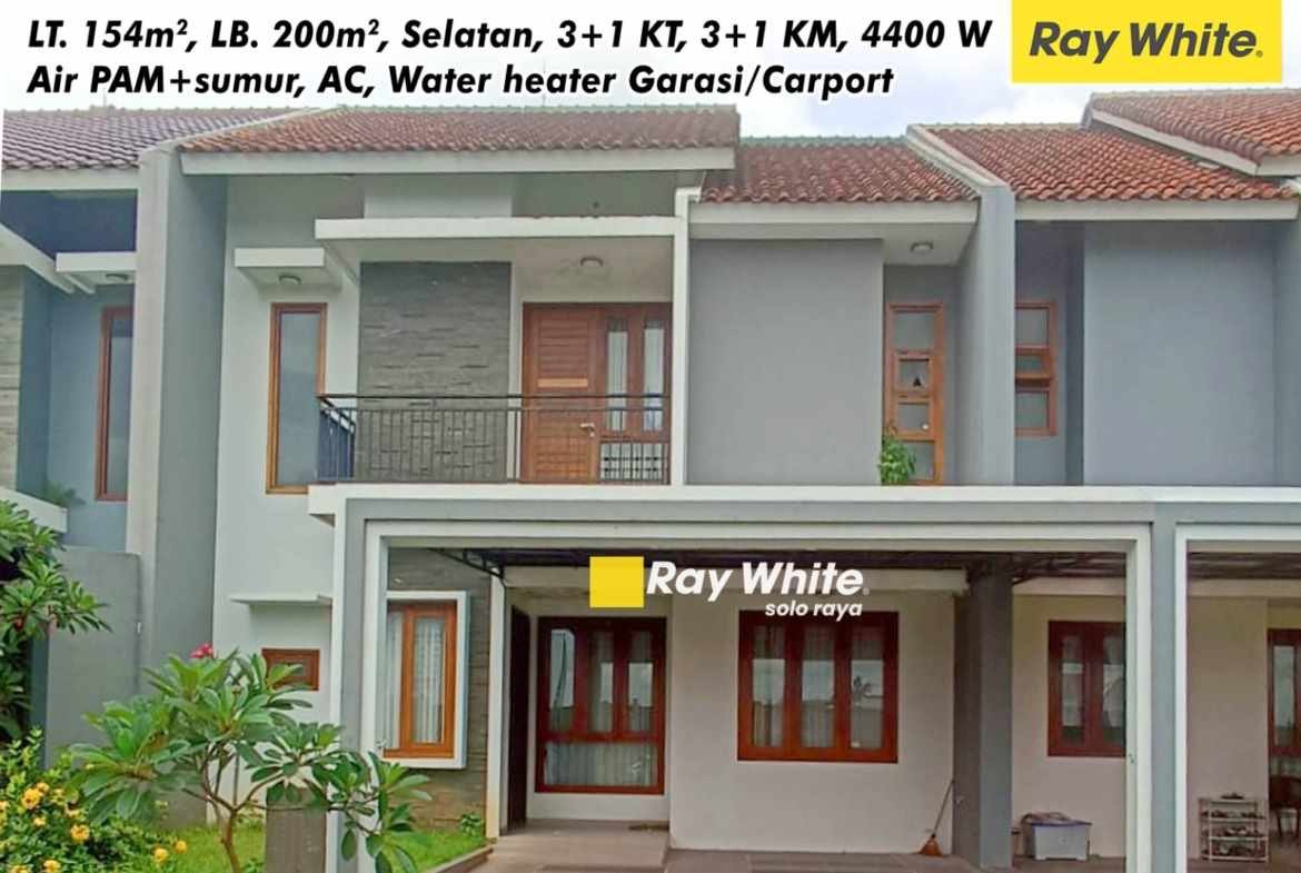 Luas Tanah 154m2, Luas Bangunan 200m2, Hadap Selatan, 4+1 Kamar Tidur, 3+1 Kamar Mandi, Listrik 4400w, Air PDAM & Sumur, AC, Water Heather, Carport, Garasi