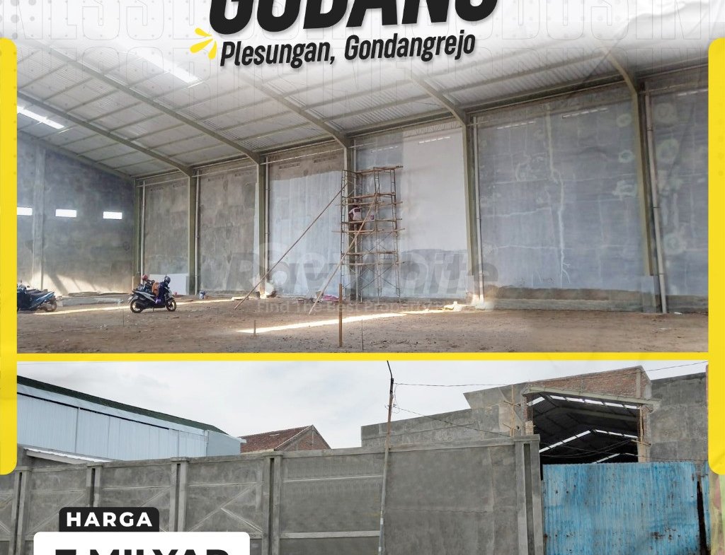 Optimalkan operasional logistik dan produksi Anda dengan fasilitas gudang yang 100% baru dan modern di lokasi paling strategis di utara Solo. Dijual sebuah gudang seluas 1000 m² di Plesungan, Gondangrejo. Dengan spesifikasi tinggi seperti pintu 4 meter dan plafon 4,5 meter, serta lokasi yang hanya beberapa menit dari Pintu Tol Gondangrejo, properti ini dirancang untuk efisiensi dan kelancaran bisnis Anda.