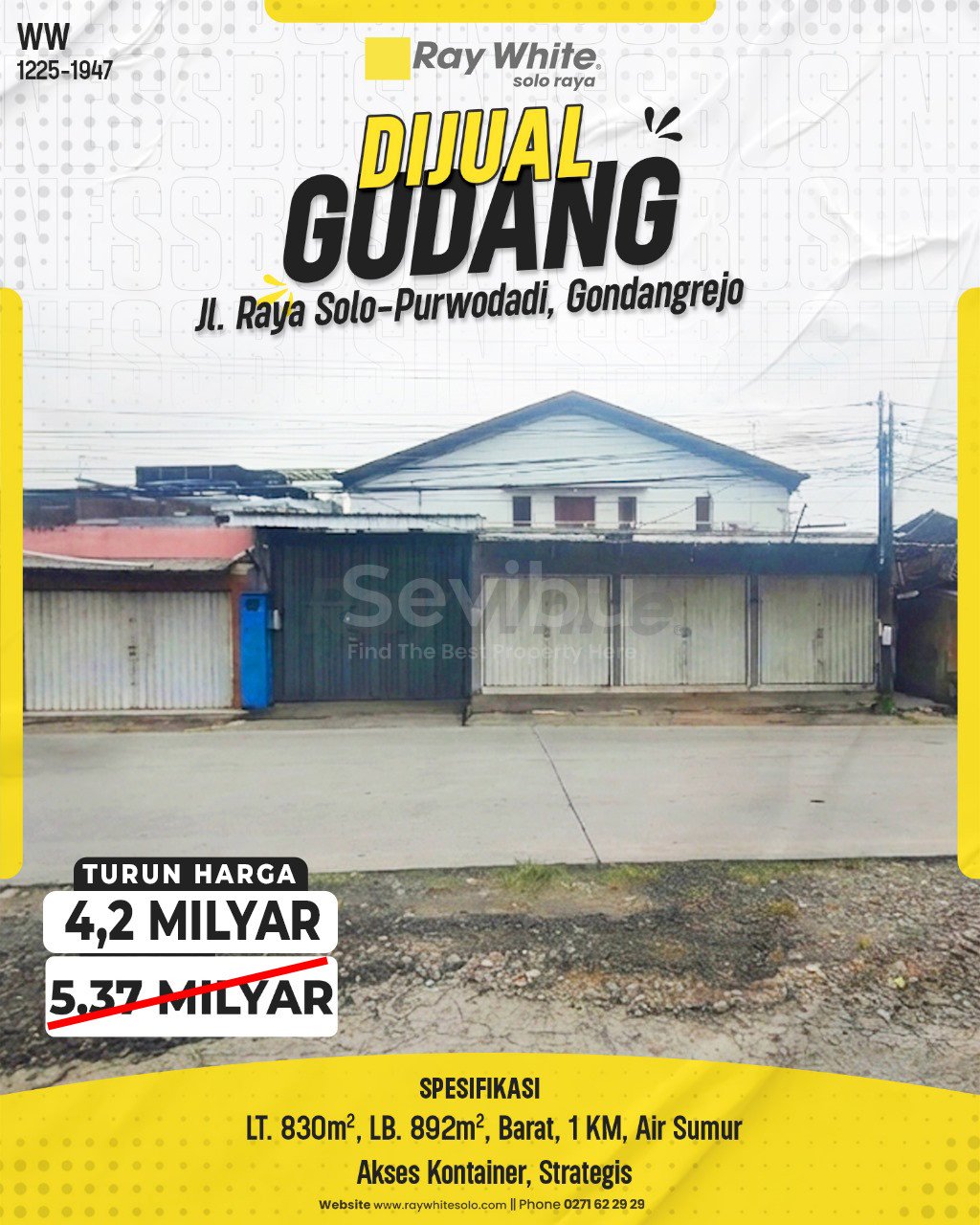 Miliki aset komersial premium yang terletak tepat di “jalur emas” distribusi Solo Raya bagian utara. Gudang luas ini berada persis di tepi Jalan Raya Solo-Purwodadi, menawarkan aksesibilitas luar biasa untuk kendaraan logistik besar termasuk kontainer. Dengan luas bangunan yang melebihi luas tanah (2 lantai/ mezanin optimal), properti ini sangat efisien untuk dijadikan pusat distribusi, gudang transit, atau workshop produksi. Lokasinya yang sangat dekat dengan pintu tol menjadikan mobilitas bisnis Anda ke arah Semarang, Surabaya, atau Yogyakarta semakin cepat dan lancar.